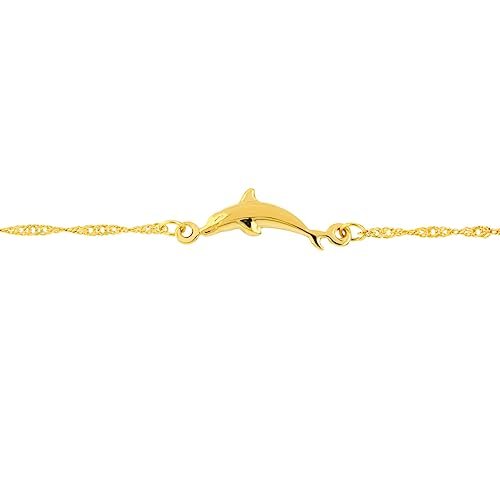 14K Real Gold Ankle Bracelet – 14K Yellow Solid Gold Dolphin Charm Anklet For Women – Dainty Twisted Singapore Chain Anklet Adjustable 9″ Up To 10″