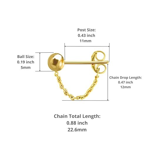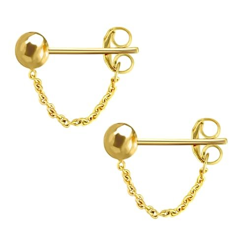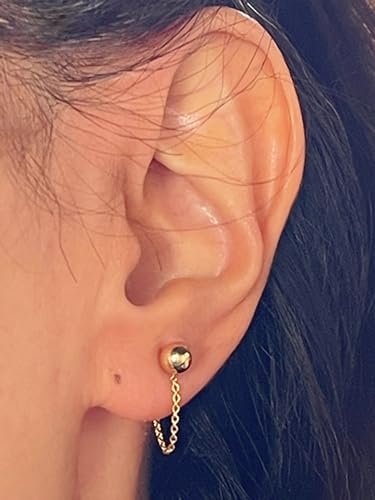 14K Solid Gold Ball Stud Chain Earrings – Dainty Minimalist Yellow Real Gold Front Back Long Post Earrings For Women