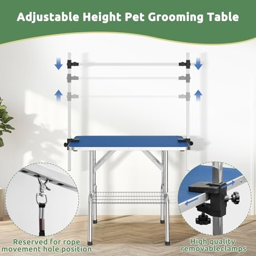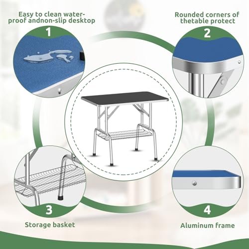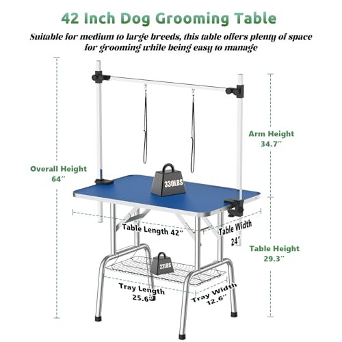 42-inch Foldable Home Dog Grooming Table with Adjustable armrests, Lasso, Non-Slip Surface and Storage net Tray, Safe and Durable, Suitable for All Kinds of Pets