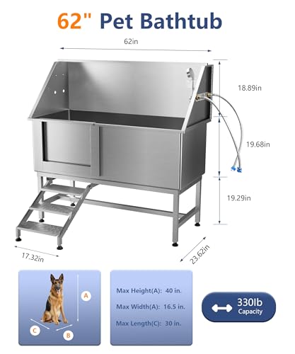 【Custom Fit for Dogs】Measuring 62″L x 23.62″W x 57.86″H, this dog bath tub is specially designed for large breeds, featuring grooved stairs for stable support and adjustable water temperature via faucet or shower head to suit your pet’s preference.
