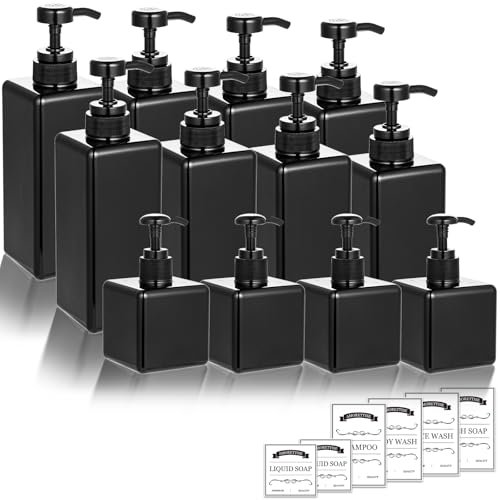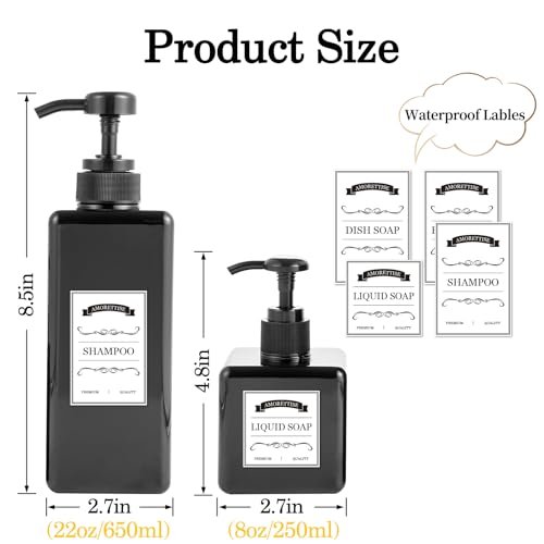 Amorettise 12 Pack Shampoo and Conditioner Dispenser Bottles, 8 Pack 22 Oz and 4 Pack 8 Oz Refillable Square Plastic Pump Bottles for Dispensing Lotions, Shampoo, Conditioner, Body Wash (Black)