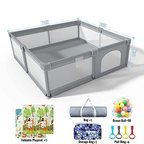 Baby Playpen 79″ X 71″, LUTIKIANG Play Yard for Babies and Toddlers with Mat, Safety Extra Large Baby Fence Area, Indoor & Outdoor Kids Activity Play Center with Anti-Slip Suckers and Zipper Gate.