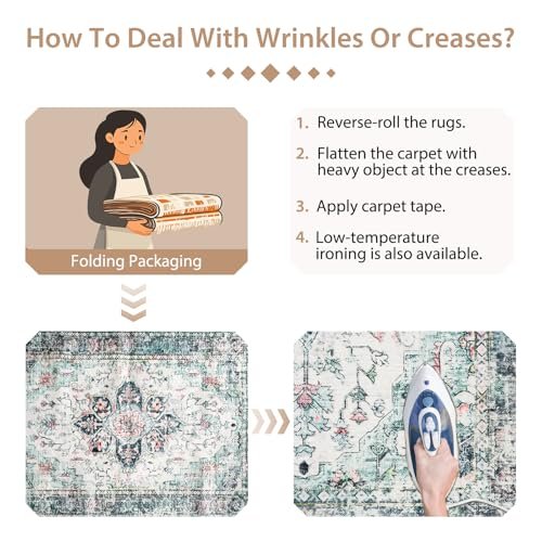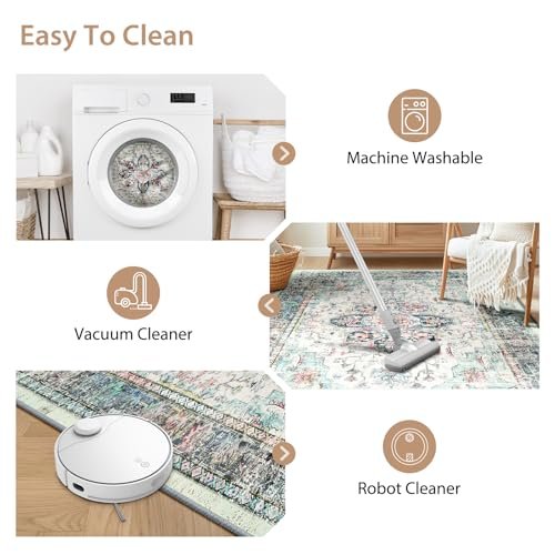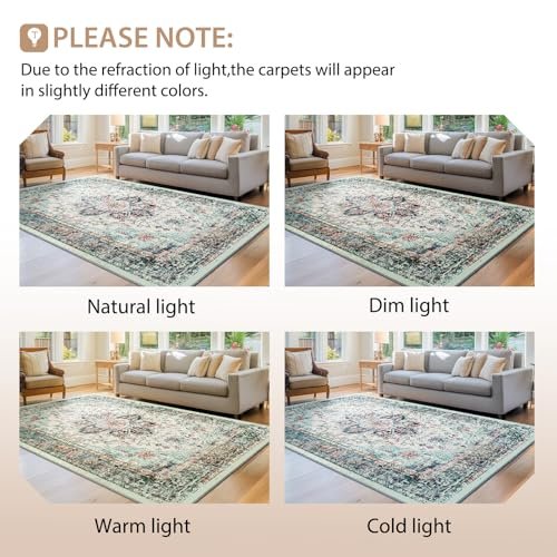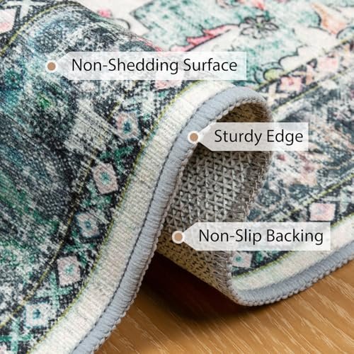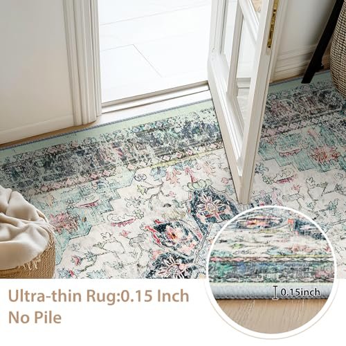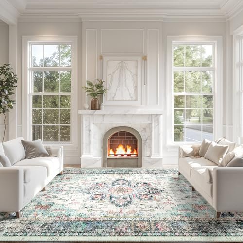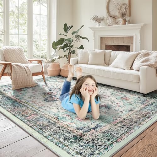 BESTSWEETIE 9×12 Area Rug Washable Rugs for Living Room, No Pile Boho Carpet for Entryway Bedroom Dinning Room, Vintage Carpet Print Distressed Non-Slip, 9 x 12 ft, Multi Navy Teal