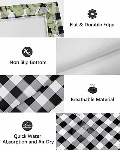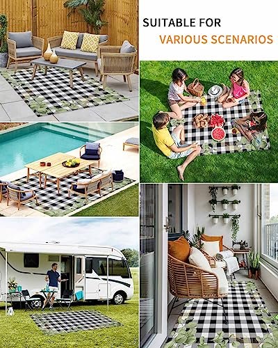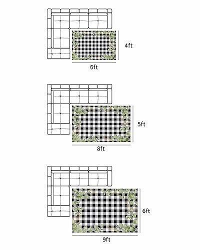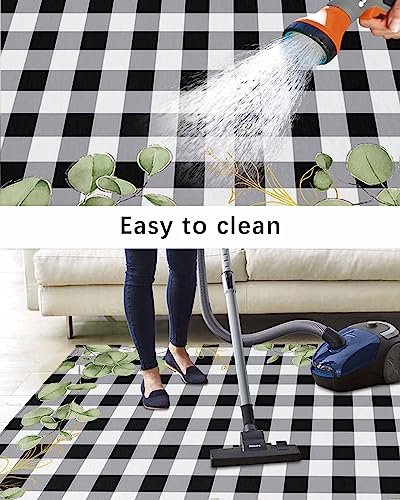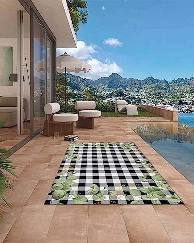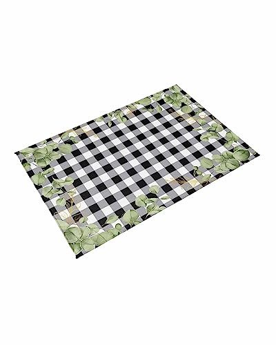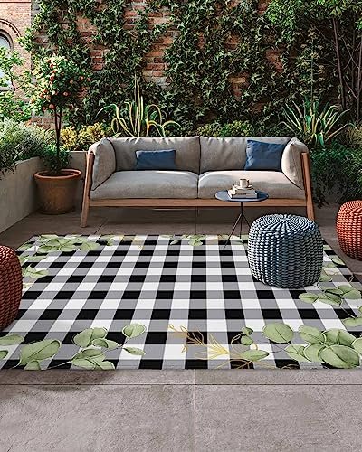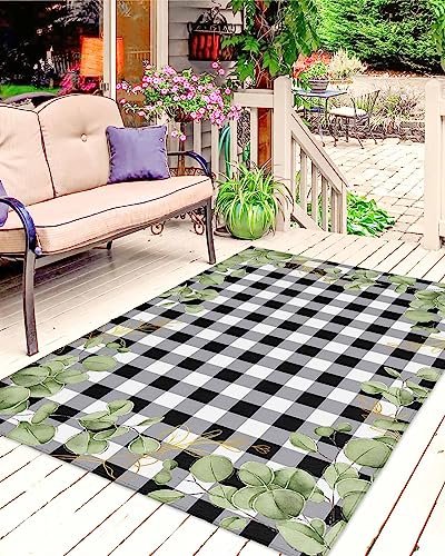 Black and White Buffalo Plaid Check Outdoor Area Rug 4’x6′,Patio Balcony Porch Front Door Camping Camper Deck Runner Rug,Washable Carpet Indoor Living Room Floor Mat Green Summer Eucalyptus Leaves