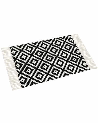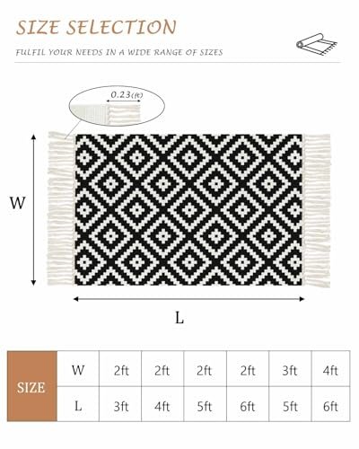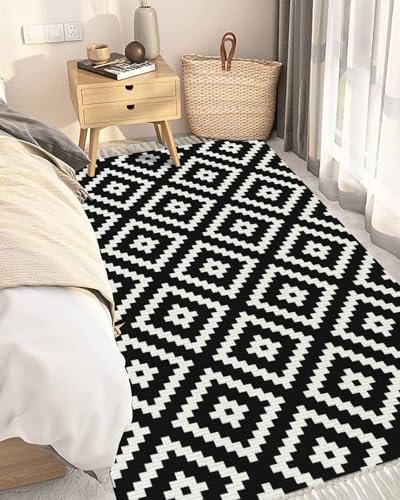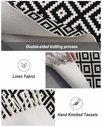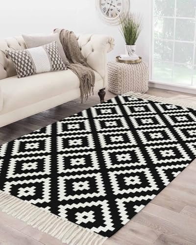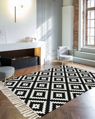 Black White Geometric, Abstract Rhombus Washable Woven Area Rug – 4 x 6 Rugs for Living Room Bedroom with Tassel, Modern Indoor Outdoor Accent Throw Classroom Dining Room Office Large Carpet