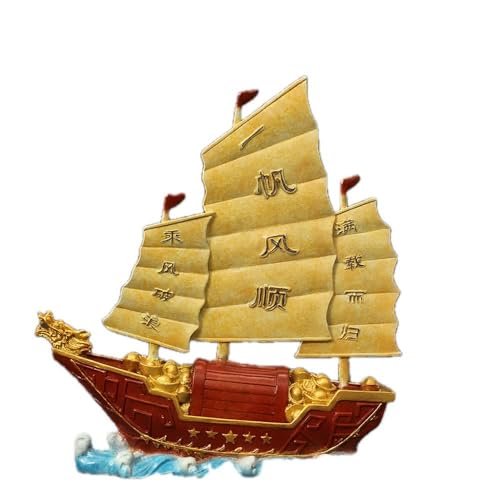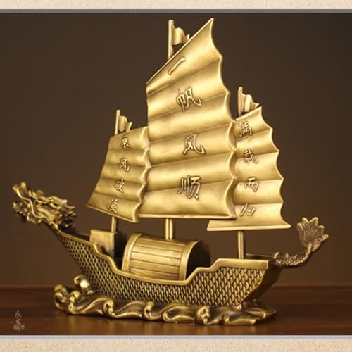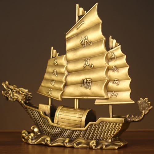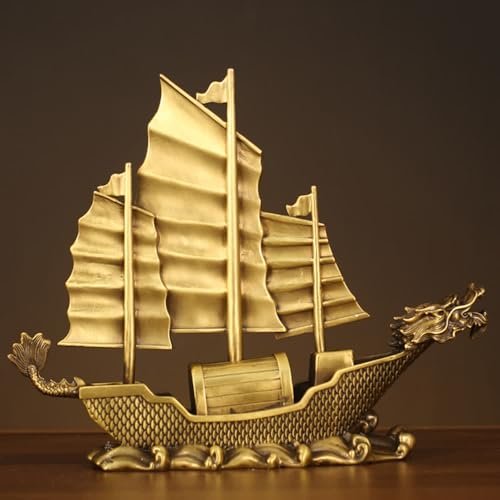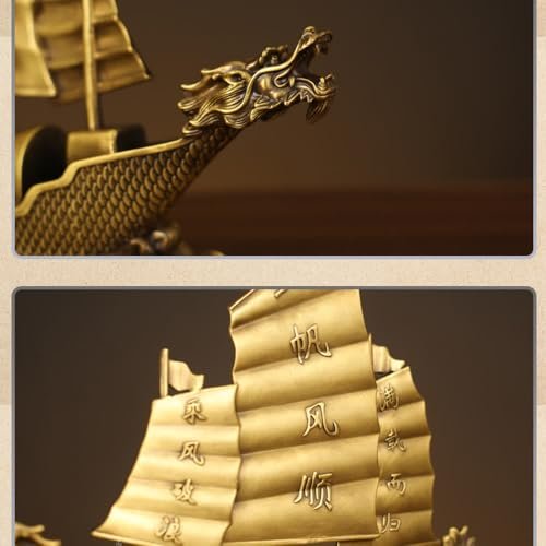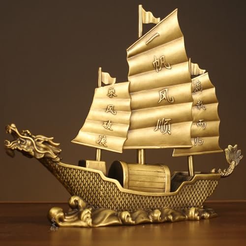 Chinese Brass Dragon Boat Sailing Ship Ornament, Auspicious ‘Smooth Sailing’ Feng Shui Office Desk Decor, Wealth Success Collectible Gift (11 inches
