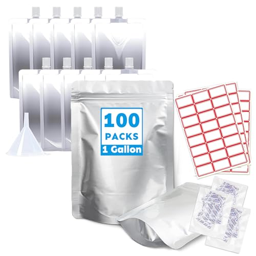 Cloudslucky 100PCS 1Gallon Mylar Bags&10PCS 16OZ Drink Bags,Stand Up Bags with Oxygen Absorbers&Labels for Food Storage,Reusable Plastic Flasks Pouches with Funnel for Beverage,Juice,Camping,BPA Free