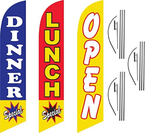 COBB PROMO Dinner Special Lunch Special and Open Yellow Feather Flag Eye Catching Banner Sign for Business and Marketing Complete Set of Three with 15 ft Pole Kits and Ground Spikes