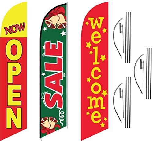 COBB PROMO Now Open Welcome And Merry Christmas Feather Flag Eye Catching Banner Sign for Business Marketing and Advertising Complete Set with 15 ft three Pole Kit and three Ground Spike