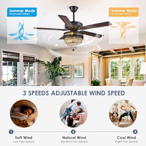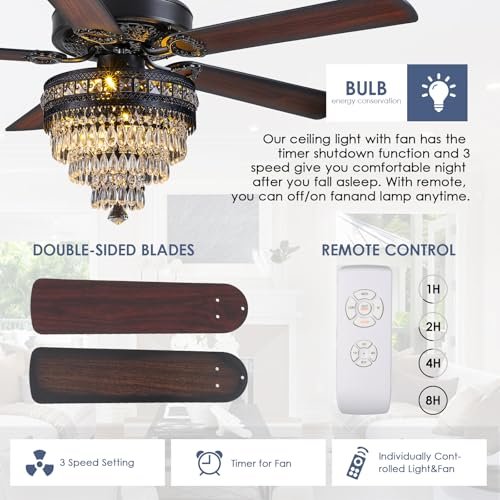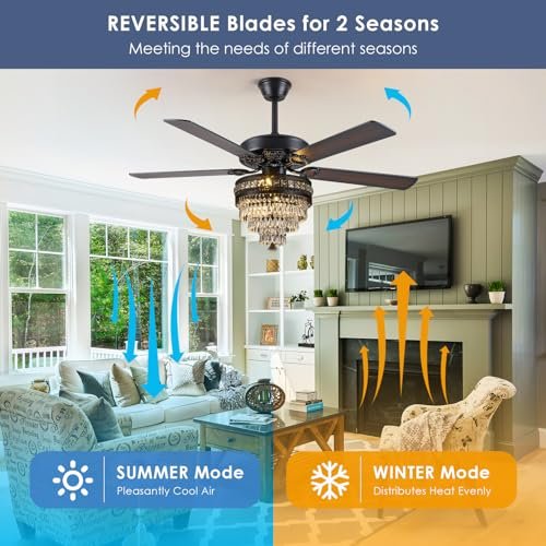 Crystal Ceiling Fan Fandelier with Lights – Modern Outdoor Fans with Remote Control,Noiseless AC Motor, Retro/Farmhouse Lighting, Dining Room, Living Room (52″
