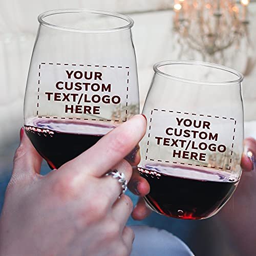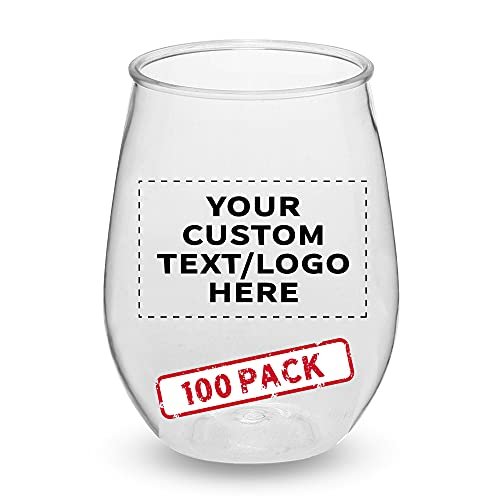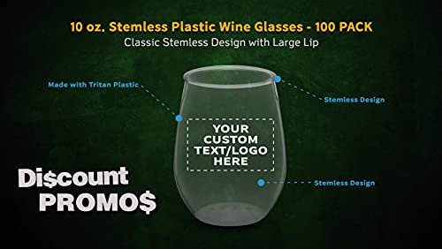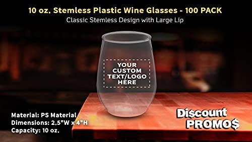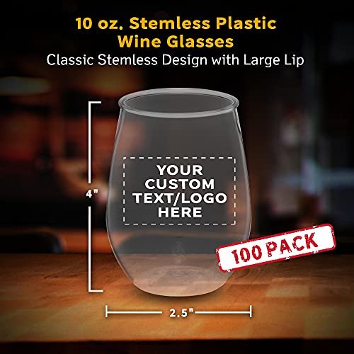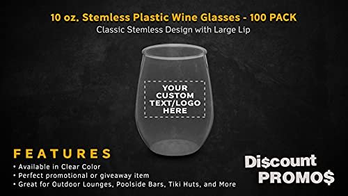 DISCOUNT PROMOS 100 Stemless Plastic Wine Glasses Set, 10 oz. – Customizable Text, Logo – Tritan, Barware – Clear