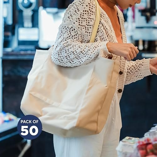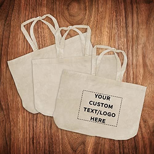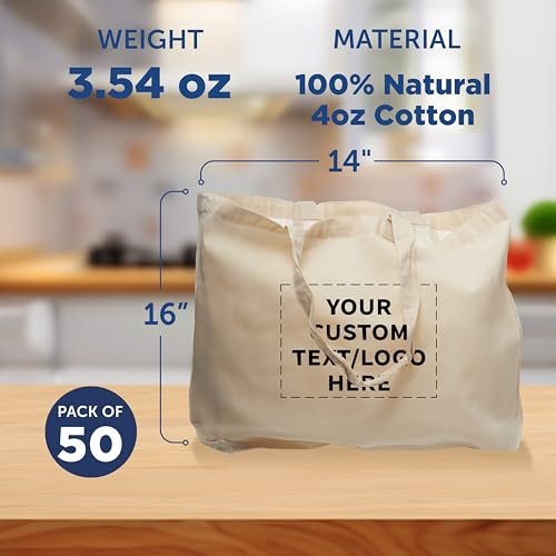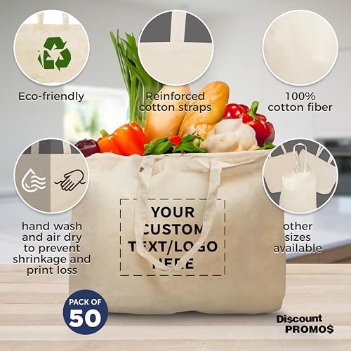 DISCOUNT PROMOS Custom Natural Cotton Fiber Tote Bags (Set of 50) – Personalized, Reusable & Eco-Friendly – Perfect for Grocery, Promotions, Branding – Natural Color, 16″x14″X4.5″, 5 OZ Cotton