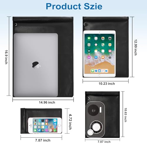 Complete Set for Secure Storage: Faraday bags includes four Faraday bags in various sizes—large (16.9″ x 14.96″), laptop pouch (12.99″ x 10.23″), medium pouch (10.63″ x 7.87″), and phone pouch (7.87″ x 4.72″); perfect for organizing and protecting multiple devices