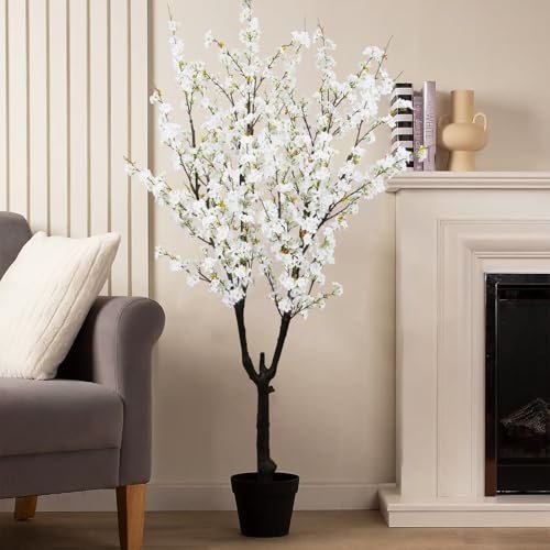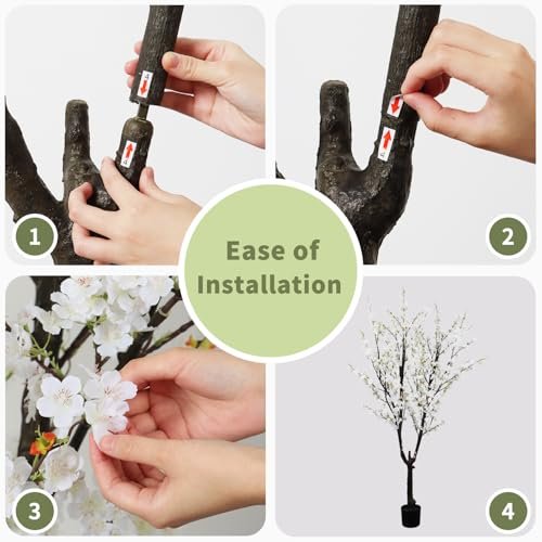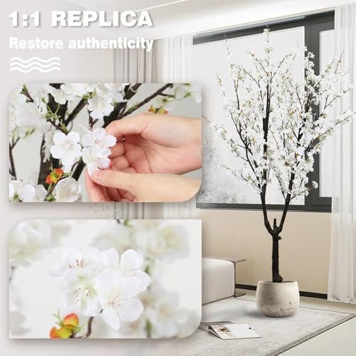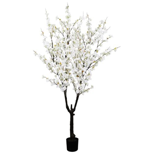 Faux White Cherry Blossom Tree 6ft(72in) Tall Artificial Plant Home Decor Handmade Natural Fake White Flower Tree for Wedding Realistic Silk Cherry Plant in Pot for Living Room,Office,Outdoor Decor.