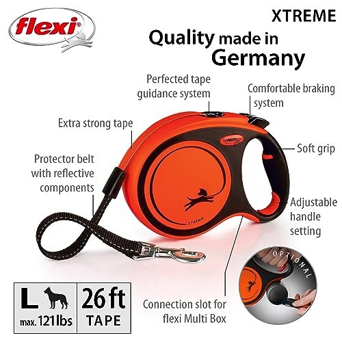 FLEXI Xtreme Tape Retractable Dog Leash for Large Dogs Upto 121 lbs. – 26 ft., Orange/Black | Tangle Free Pet Walking Leash with One-Handed Brake, Pause, Lock | German Quality Product