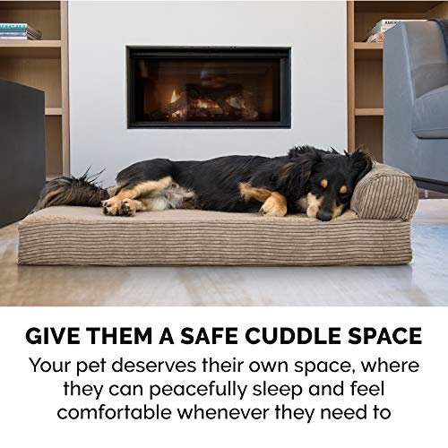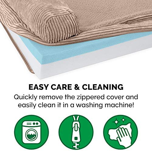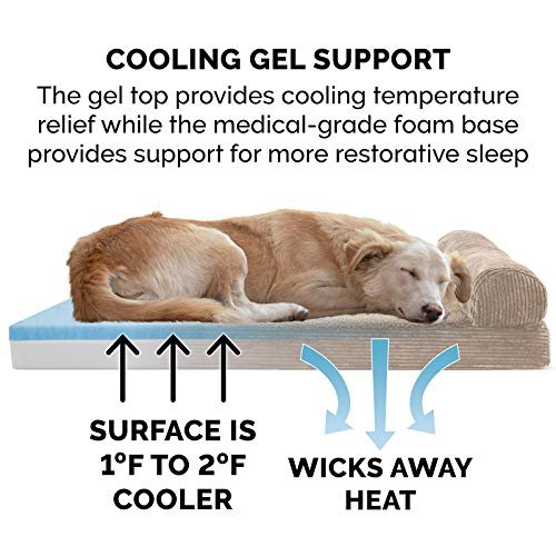 Furhaven Cooling Gel Dog Bed for Large Dogs w/ Removable Bolster & Washable Cover, For Dogs Up to 125 lbs – Fleece & Corduroy Bolster Chaise – Sandstone, Jumbo Plus/XXL