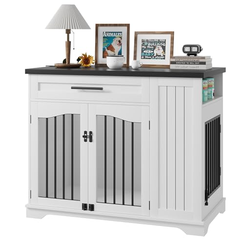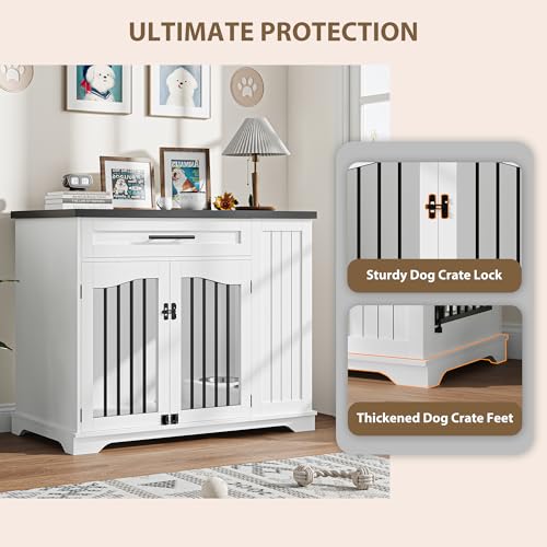 Furniture Style Dog Crate for Large Dogs, 44 Inch Heavy Duty Wooden Dog Kennel Furniture with Drawer & Side Storage and Bulit-in Feeding Station,White Set of 2