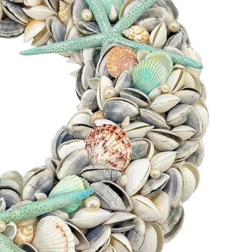 Galt International 23″ Nautical Seashell Wreath, Blue | Coastal Beach Floral Home Decor Indoor Outdoor Real Starfish Pearl Seashells