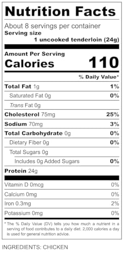PACKAGE CONTENTS: Contains 10 chicken tenderloins weighing 7 ounces (198 grams), equivalent to 2 pounds of fresh chicken when rehydrated