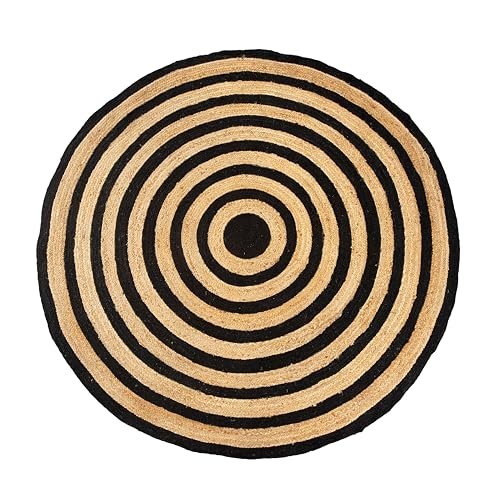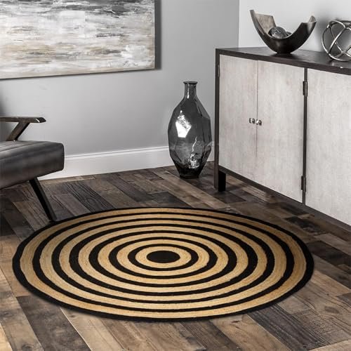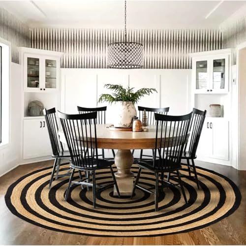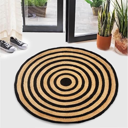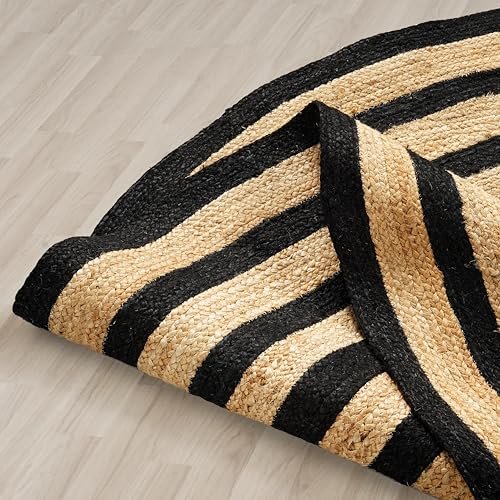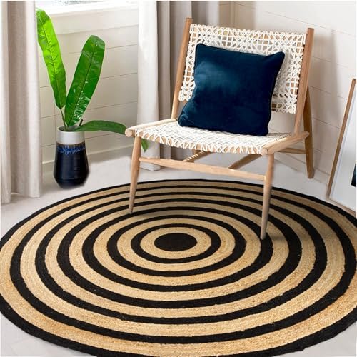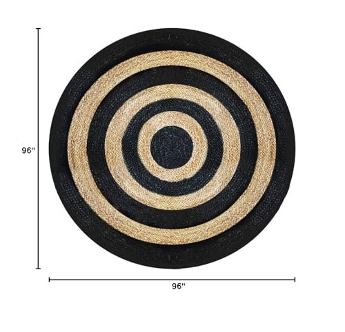 GRUHUM Round Jute Black Area Rugs 8ft Natural Fibre Rug with Rings Handwoven Boho Reversible Farmhouse Braided Rustic Vintage Rug Indoor Kitchen Bedroom Living Room Hallways Enterways 8 feet Circle