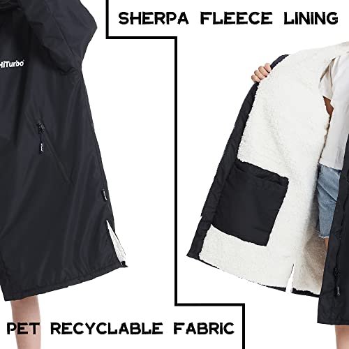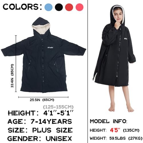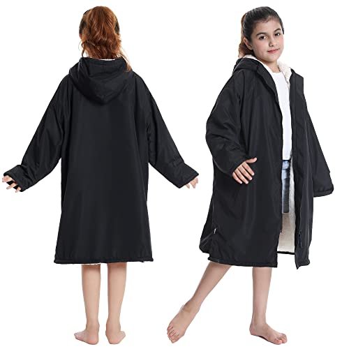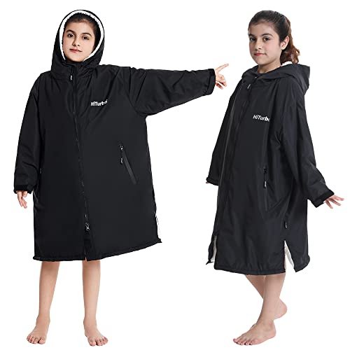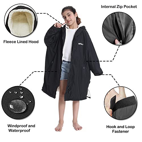 Hiturbo Warm Kids Swim Parka: Waterproof Changing Robe – Thick Fleece Lining – Oversize Swimming Coat – Hooded Surf Poncho (7-14Y, Black)
