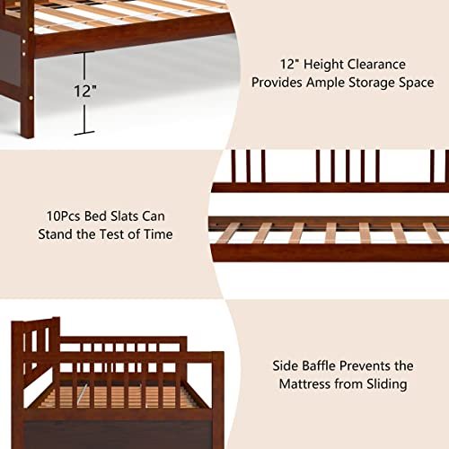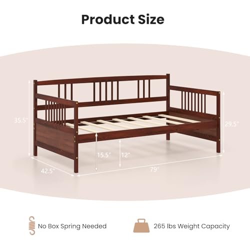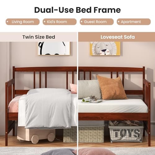 HOMGX Twin Wooden Daybed Frame, Sofa Bed w/Solid Wood Slats Support Frame & Rails, Dual-Use Heavy Duty Modern Bed Platform for Living Room/Bedroom/Deck/Children Room/Office/RV (Cherry)