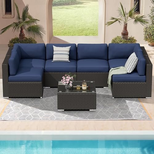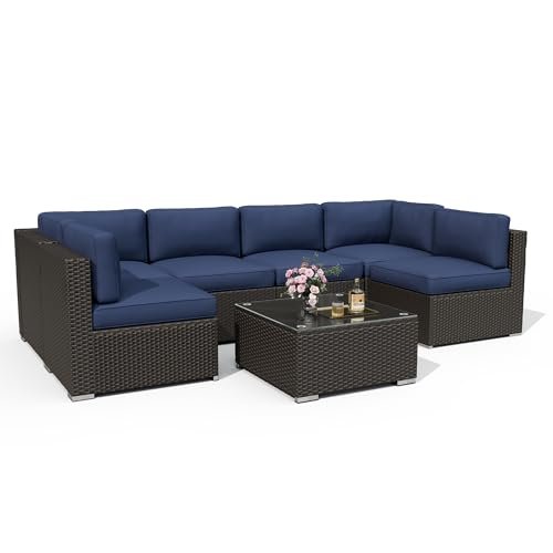 Incbruce Outdoor Patio Furniture Set 7-Piece All-Weather Sectional Sofa Outside Couch, Manual Weaving Wicker Rattan Conversation Set with Glass Top Table and Removable Cushions(Dark Blue)