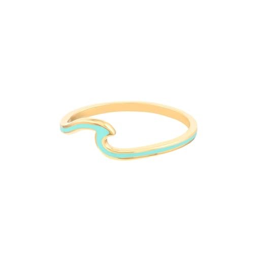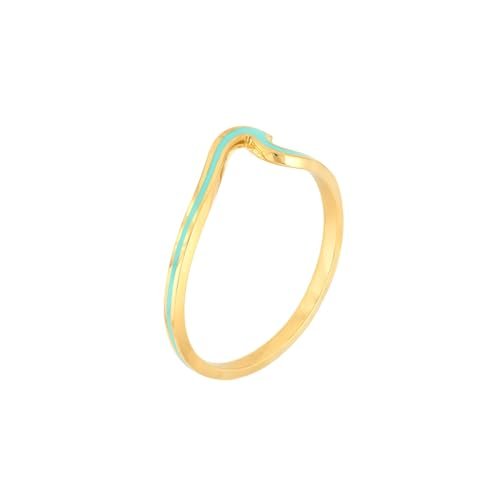 JEWELHEART 14K Solid Gold Ring for Women – Dainty Turquoise Enamel Wave Ring – Minimalist Simple 14K Yellow Real Gold Stacking Ring Size 8