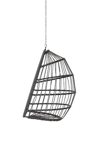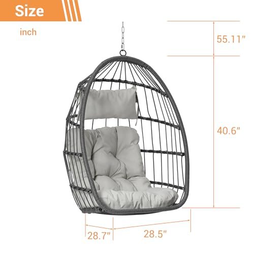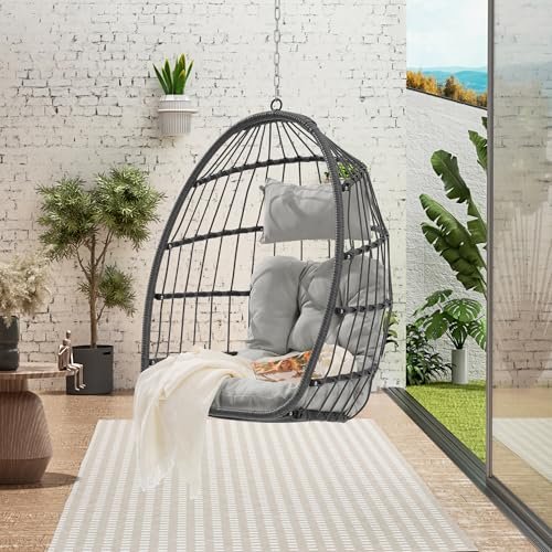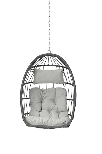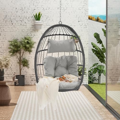 KEIKI Hanging Egg Chair, Outdoor Patio Swing Basket Egg Chair with Cushion, 360LBS Load Rattan Wicker Hammock Chair for Balcony, Garden, Living Room, Light Grey