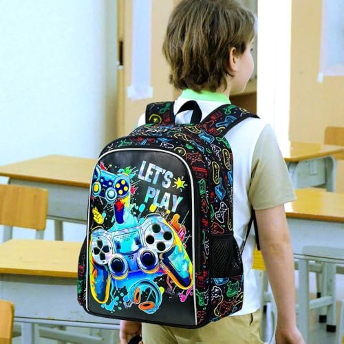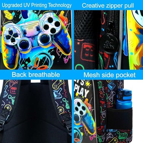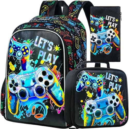 KLFVB 3PCS Boys Backpack, 16″ Game Kids Bookbag and Lunch Box, Water Resistant Preschool Backpacks for Elementary Students