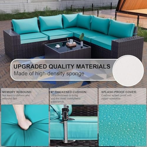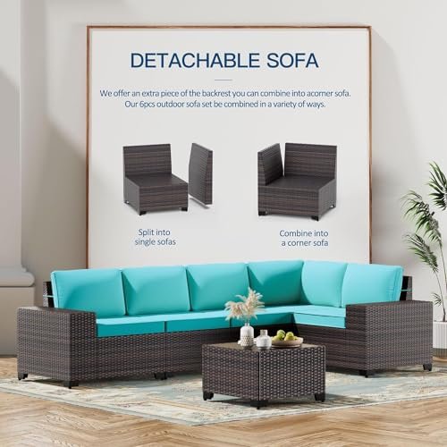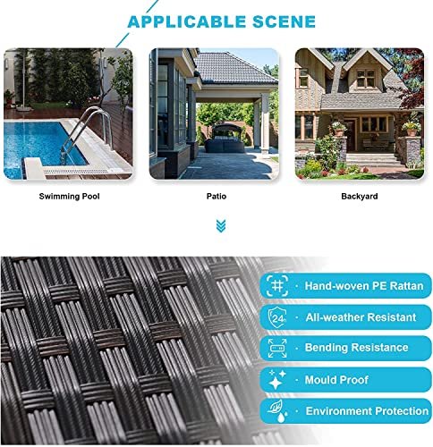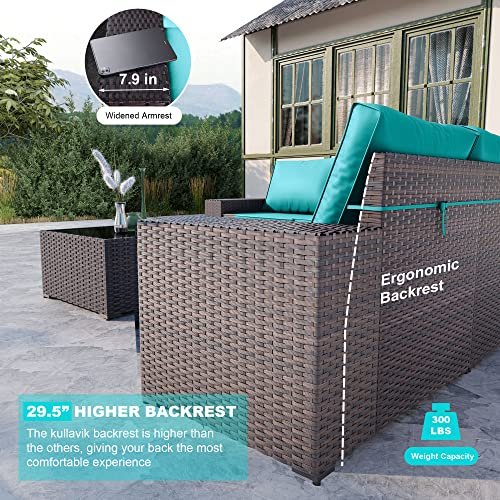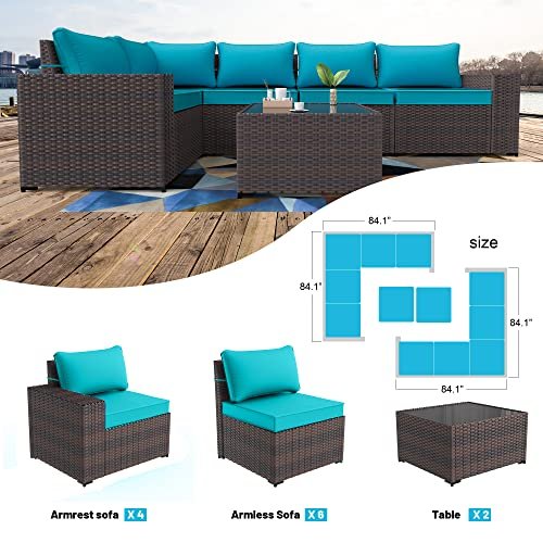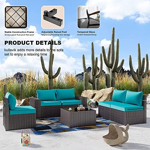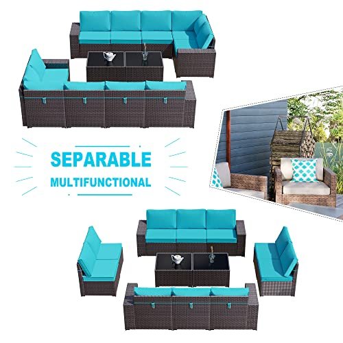 Kullavik Outdoor Patio Furniture Set 12 Pieces Sectional Rattan Sofa Set Brown PE Rattan Wicker Patio Conversation Set with 10 Blue Seat Cushions and 2 Tempered Glass Table