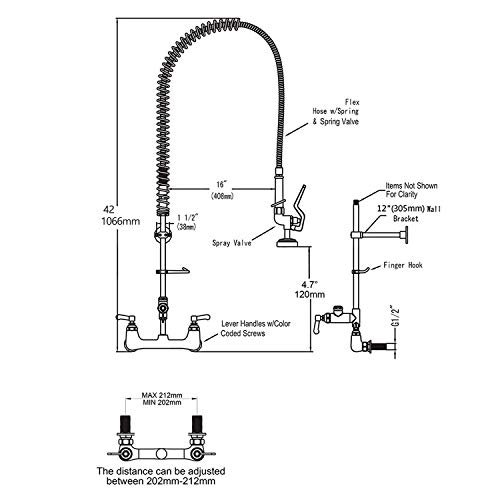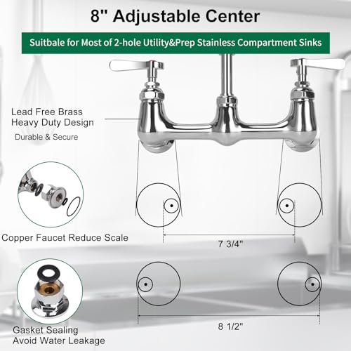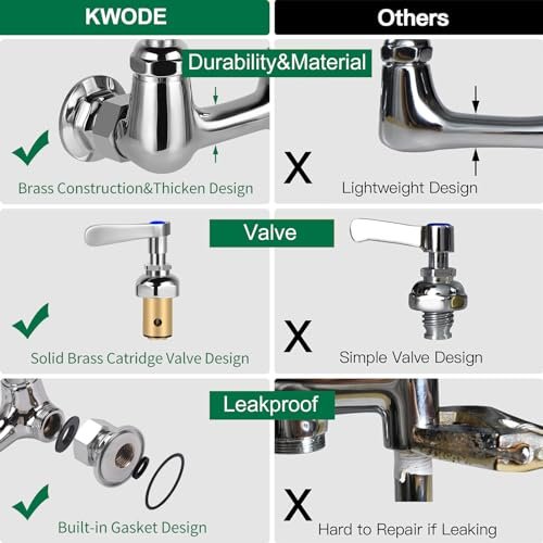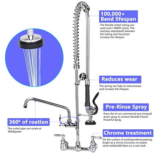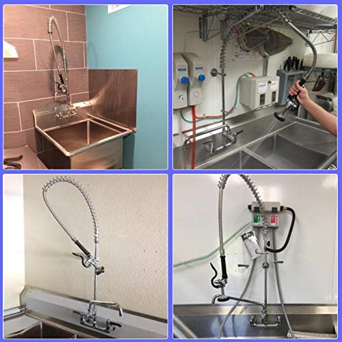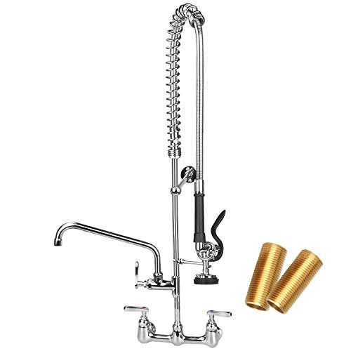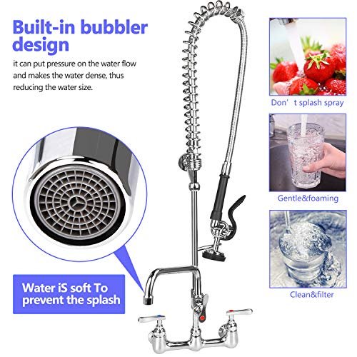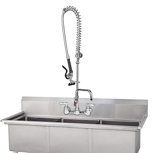 KWODE Commercial Restaurant Kitchen Faucet with Pre-Rinse Sprayer, 8” Center 42” Height Wall Mount Pull Down Sprayer Sink Faucet with 12” Swivel Spout for Industrial Kitchen 2 or 3 Compartment Sink