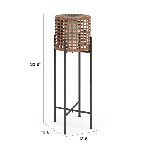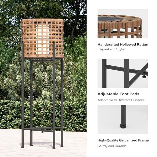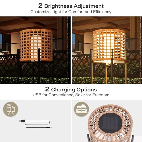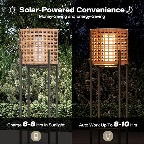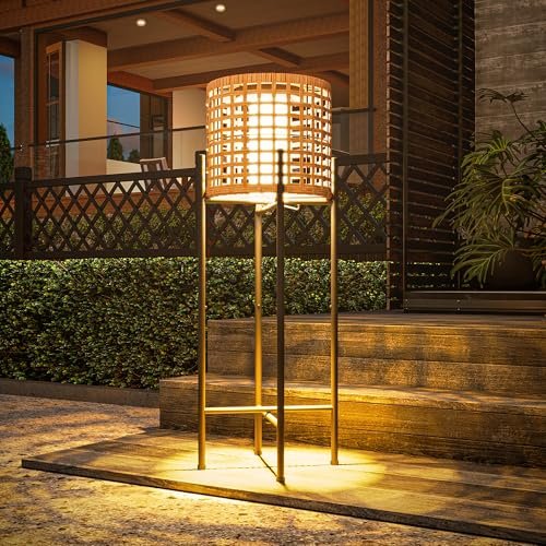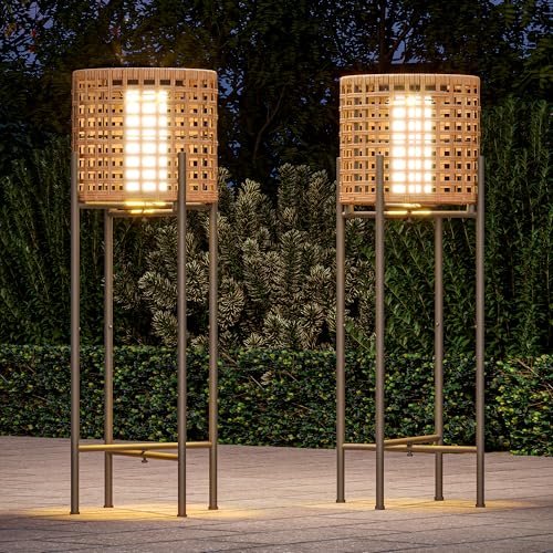 LAUSAINT HOME Solar Powered Outdoor Floor Lamp with Auto On/Off LED Light, Waterproof Wicker Patio Floor Lights, Boho Rattan Floor Lantern for Patio, Yard, Deck, Garden or Porch Decor (2 PCS)