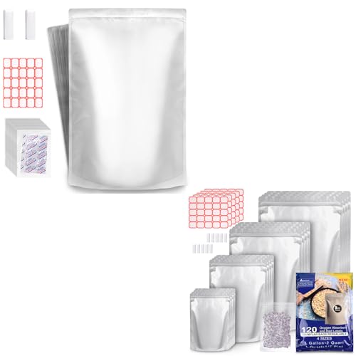 [Mylar Bags Set] Mylar bags for food storage with oxygen absorbers set include 5 sizes: 5 Gallon mylar bags (15 pcs), 1 Gallon mylar bags 10″x14″(20 pcs), 2 Quart mylar bags 7.5″x11.5(25 pcs), 1 Quart mylar bags 6″x9″(35 pcs), 1/2 Pint mylar bags 4.3″x6.3″(40 pcs). With 120 oxygen absorbers & 15 pack single sealed 2500cc oxygen absorber and 150 labels, suitable for a wide range of food storage.
