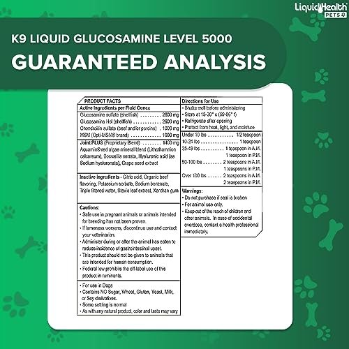 LIQUIDHEALTH Pets K9 Liquid Glucosamine Level 5000 for Large Breeds with Chondroitin, MSM – Pet Joint Health Supplements, Dog Vitamins Hip Joint Juice, Dog Joint Oil – Made in The USA (1 Gallon)