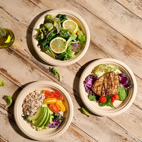 100% plant-based recycled bagasse and bamboo, no trees were used to create the paper dinner plates! Just sugar cane leftovers turned into paper-like biodegradable plates. Sturdy and strong thick paper plates able to resist oil, sogginess, bending, and knife cuts.