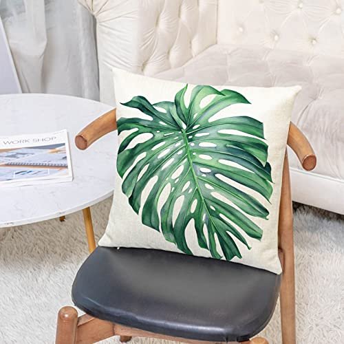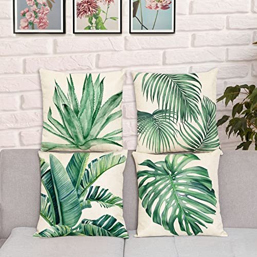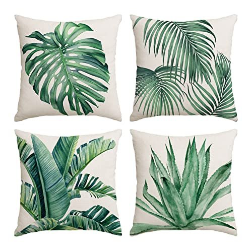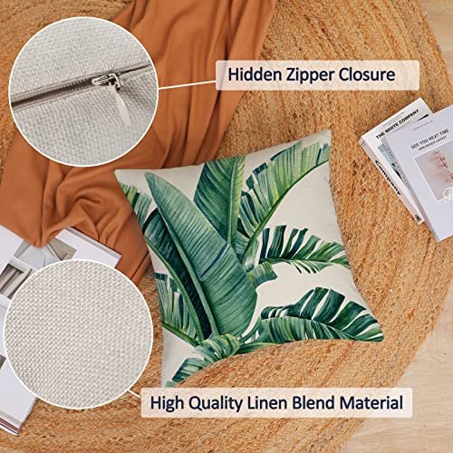 Neatee Living Set of 4 Green Plants Decorative Throw Pillow Covers 12×12 Inch Summer Decorations Linen Square Pillow Cases Tropical Plants Outdoor Sofa Couch Home Bed Decor Cushion Covers (12 by 12)