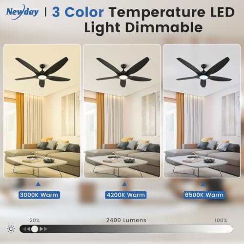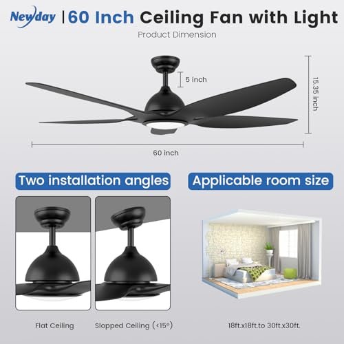 Newday 60 inch Black Ceiling Fan with Light Remote Control, Dimmable 3 CCT LED Ceiling Fans with Lights, 6 Speeds Reversible DC Motor Modern Ceiling Fan for Living Room Bedroom Indoor Outdoor