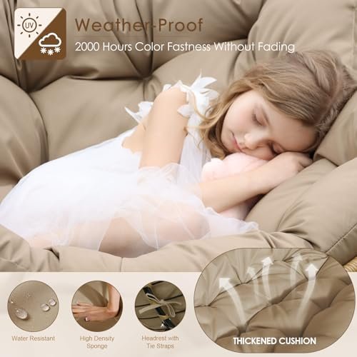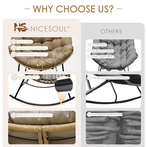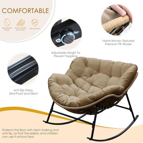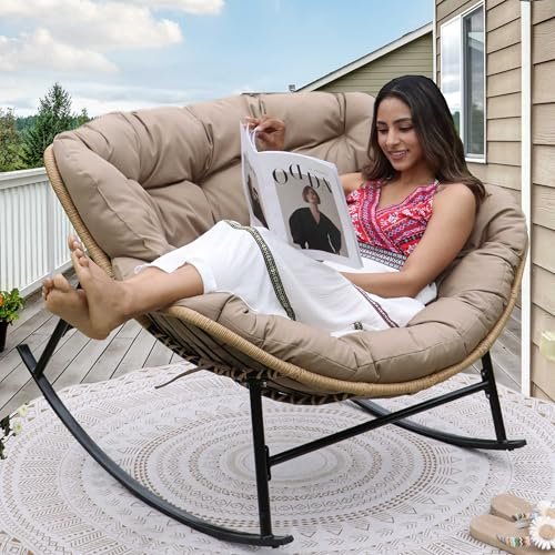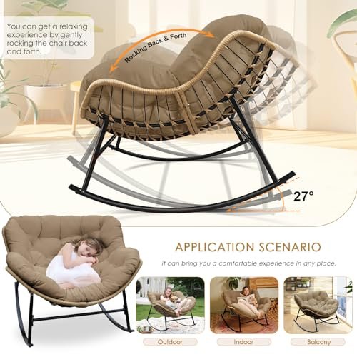 NICESOUL Indoor Outdoor Papasan Rocking Chair with Cushion, Oversized All Weather Patio Wicker Egg Rocker, 450Lbs Capacity, Sturdy Comfy Recliner Lounger for Balcony, Backyard, Porch, Bedroom, Brown