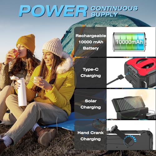 [Continuous Power Supply]: Emergency radio is always at the ready! The powerful weather radio has 3 charging options, with a 10000mAh/37000mWh rechargeable battery that can be charged via USB cable, solar panel or hand crank. More convenient and reliable for instant, automatic, all-day messaging about weather alerts. Remains operational in the event of an emergency power outage