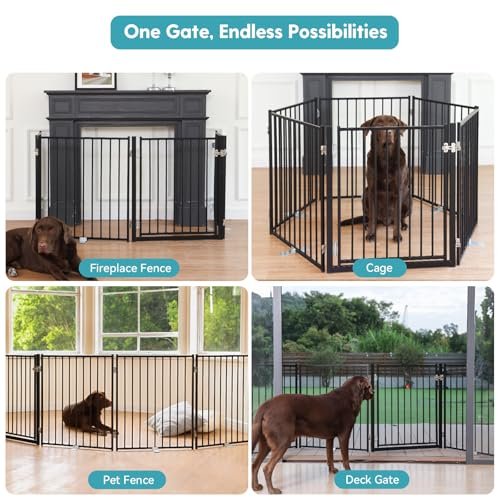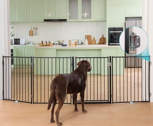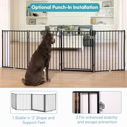 No Pawblems Free Standing Dog Gate with Door, 30” Tall Foldable Dog Fence for Indoor & Outdoor, Up to 104 Inch Extra Wide Puppy Gate for Stairs, Hallways, Doorways, Deck, Yard (Black, 4 Panels)