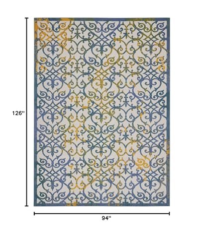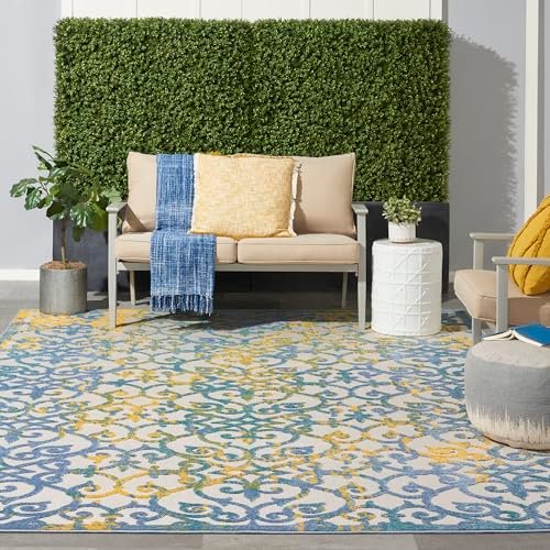 Nourison Aloha Indoor/Outdoor Ivory Blue 7’10” x 10’6″ Area -Rug, Transitional, French Country, Easy -Cleaning, Non Shedding, Bed Room, Kitchen, Living Room, Deck, Backyard, (8′ x 11′)