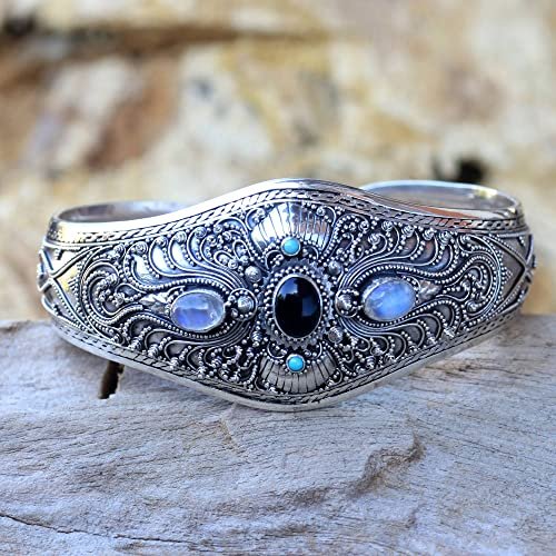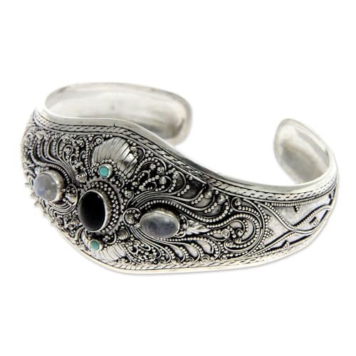 NOVICA Artisan Handmade Onyx Moonstone Cuff Bracelet Silver Sterling Reconstituted Turquoise Indonesia Birthstone Balinese Traditional [6.25 in L (end to End) x 1.2 in W] ‘ Radiant Bali’