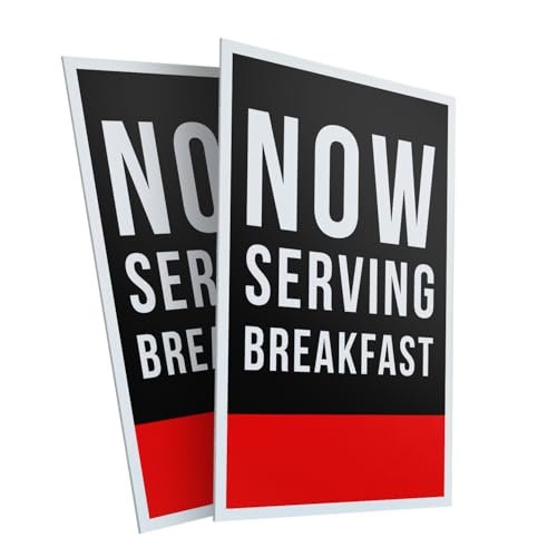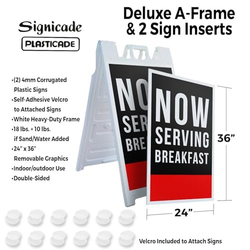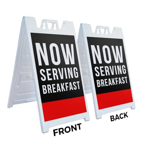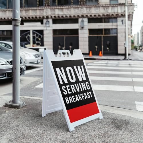 Now Serving Breakfast 24″ x 36″ Double Sided A-Frame Sidewalk Sign Includes 2 Plastic Inserts Foldable Portable White Signicade Sandwich Board Morning Specials Restaurant Promotions Freshly Cooked