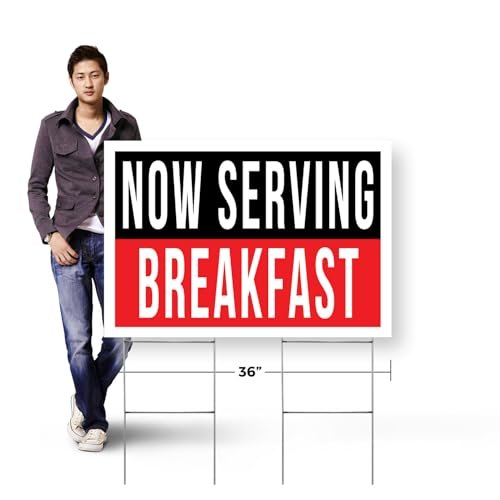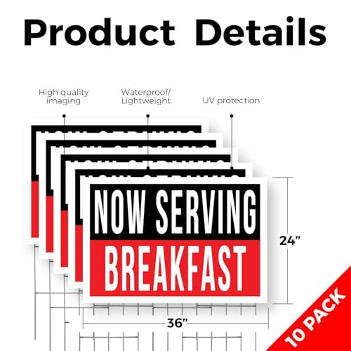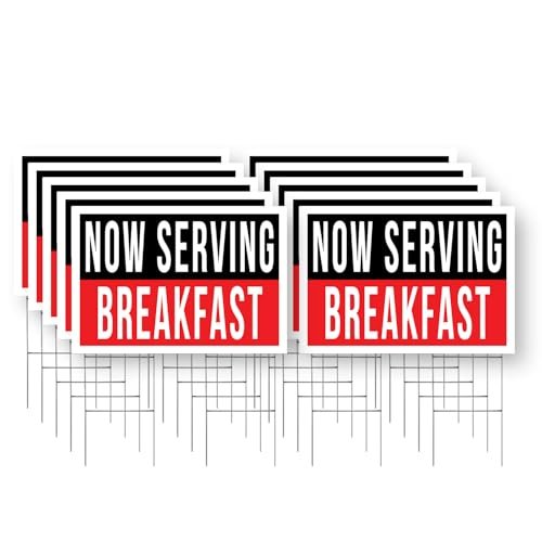 Now Serving Breakfast Yard Sign 10 Pack of 24 Inch x 36 Inch Double Sided Weatherproof Heavy-Duty Plastic with Stake | Morning Specials, Restaurant Promotions, Freshly Cooked | Made in USA