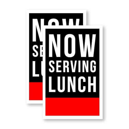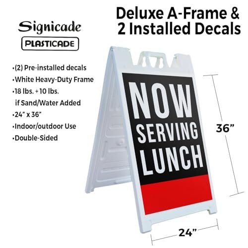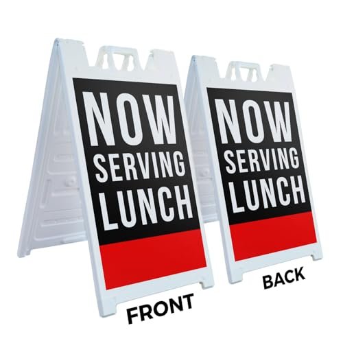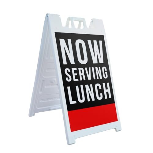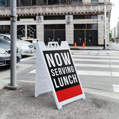 Now Serving Lunch 24″ x 36″ Double Sided A-Frame Sidewalk Sign Includes 2 Installed Decals Foldable Portable White Signicade Sandwich Board Restaurant Promotions Freshly Made Meals Midday Specials