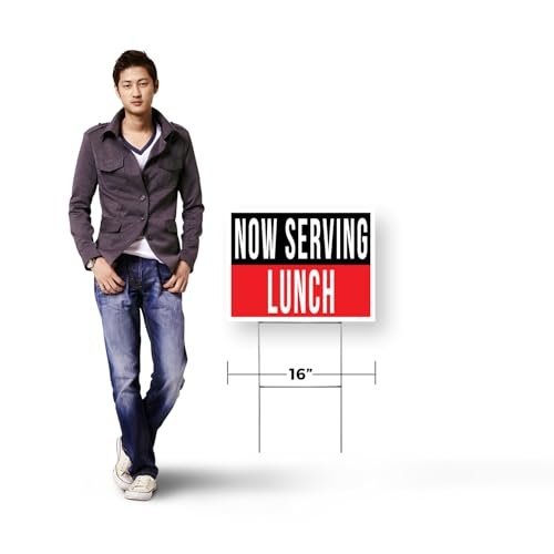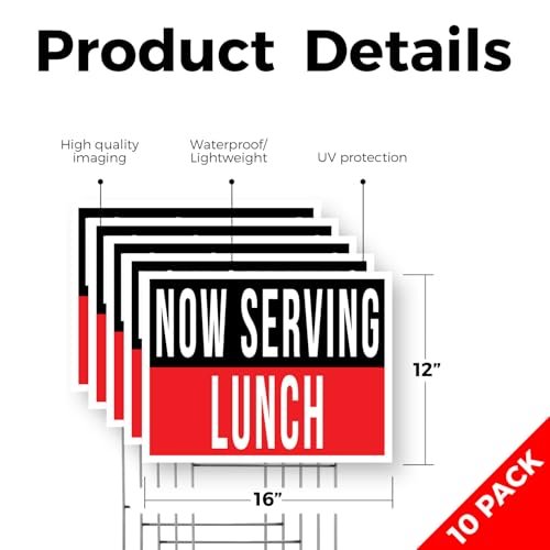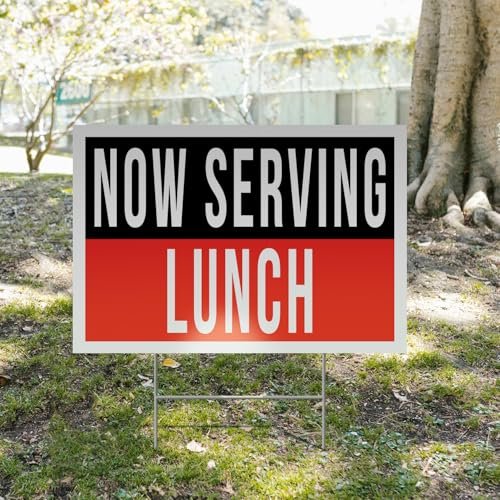 Now Serving Lunch Yard Sign 10 Pack of 12 Inch x 16 Inch Double Sided Weatherproof Heavy-Duty Plastic with Stake | Restaurant Promotions, Freshly Made Meals, Midday Specials | Made in USA