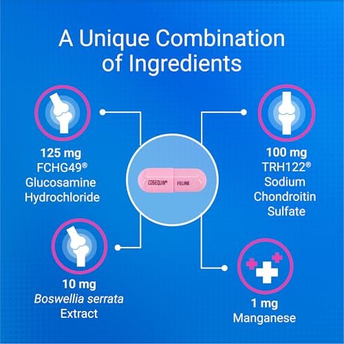 Contains Glucosamine for Cats – Cosequin contains glucosamine hydrochloride (FCHG49) and sodium chondroitin sulfate (TRH122). This unique combination of ingredients supports healthy joints.