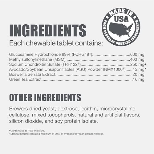 ASU COMPLIMENTS GLUCOSAMINE AND CHONDROITIN SULFATE: Dasuquin is a comprehensive joint supplement for dogs with ASU, a plant lipid shown to be safe in dogs.