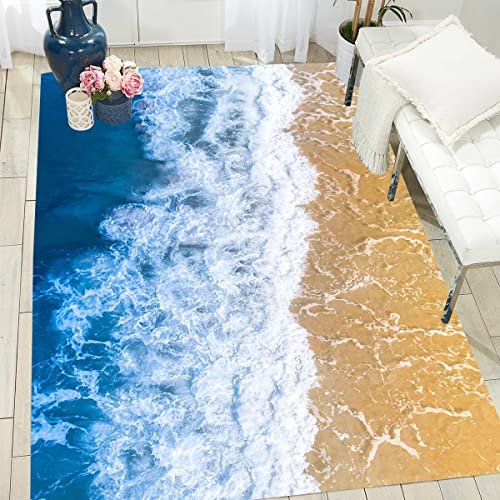Ocean Waves Beach Theme 3D Vision Blue Brown Washable 6×9 Area Rug for Livingroom Bedroom Modern Aesthetic Office Diningroom Floor Carpet Indoor Kitchen Hallway Runner Rug